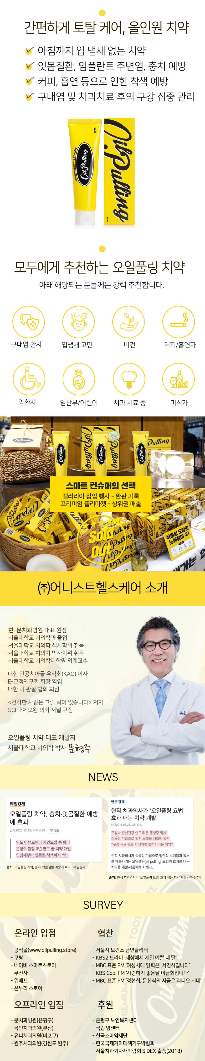 [의약외품] 제품명 : 오일풀링치약 / 중량 : 120g, 3개입 / 전성분 -유효성분 : 아미노카프로산, 이산화규소, -기타첨가제 : D-소르비톨액, 괄루인, 글리세린, 님나무잎, 산수유, 알킬(8-16)글루코사이드, 염화나트륨, 자몽종자추출물, 자일리톨, 정제수, 향료(유칼립투스향), 차전자피, 카르복시메틸셀룰로오스나트륨, 토복령가루, 팔각회향, 폴리에틸렌글리콜1500, 피마자오일 / 보관방법 : 기밀용기, 실온(1~30℃)보관 / 용법 및 용량 : 적당량을 칫솔에 묻혀 칫솔질에 의해 치아를 닦는다