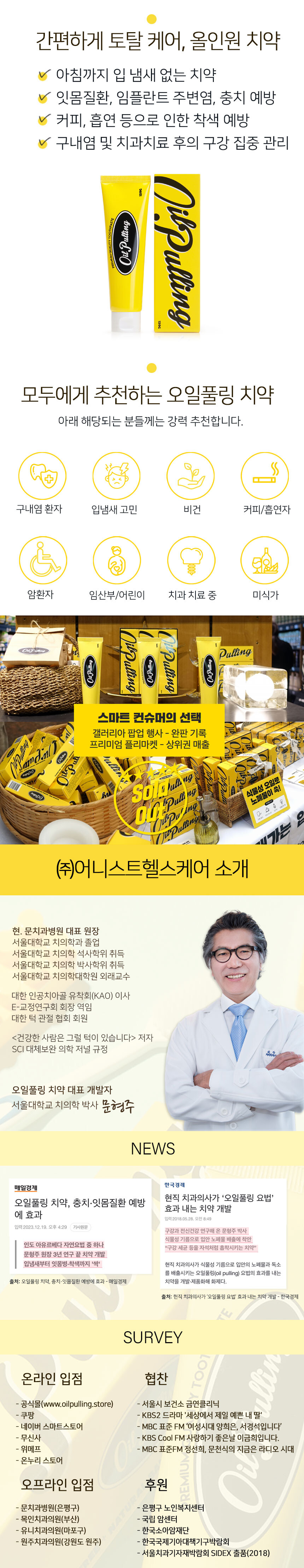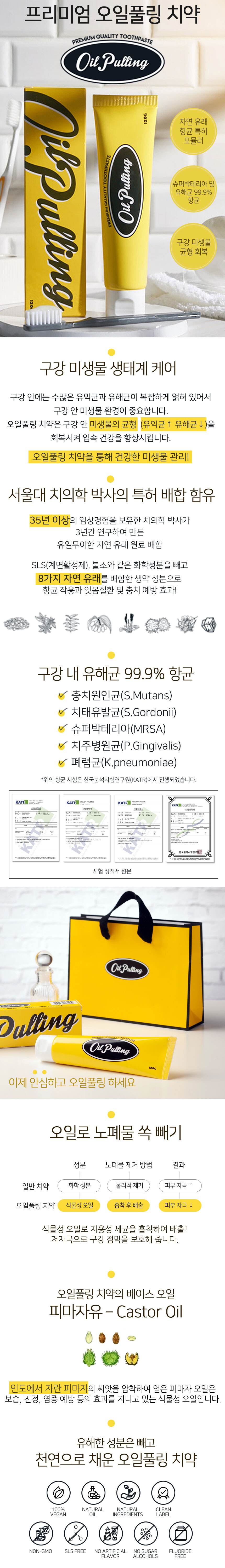 [의약외품] 제품명 : 오일풀링치약 / 중량 : 120g, 3개입 / 전성분 -유효성분 : 아미노카프로산, 이산화규소, -기타첨가제 : D-소르비톨액, 괄루인, 글리세린, 님나무잎, 산수유, 알킬(8-16)글루코사이드, 염화나트륨, 자몽종자추출물, 자일리톨, 정제수, 향료(에델바이스향), 차전자피, 카르복시메틸셀룰로오스나트륨, 토복령가루, 팔각회향, 폴리에틸렌글리콜1500, 피마자오일 / 보관방법 : 기밀용기, 실온(1~30℃)보관 / 용법 및 용량 : 적당량을 칫솔에 묻혀 칫솔질에 의해 치아를 닦는다